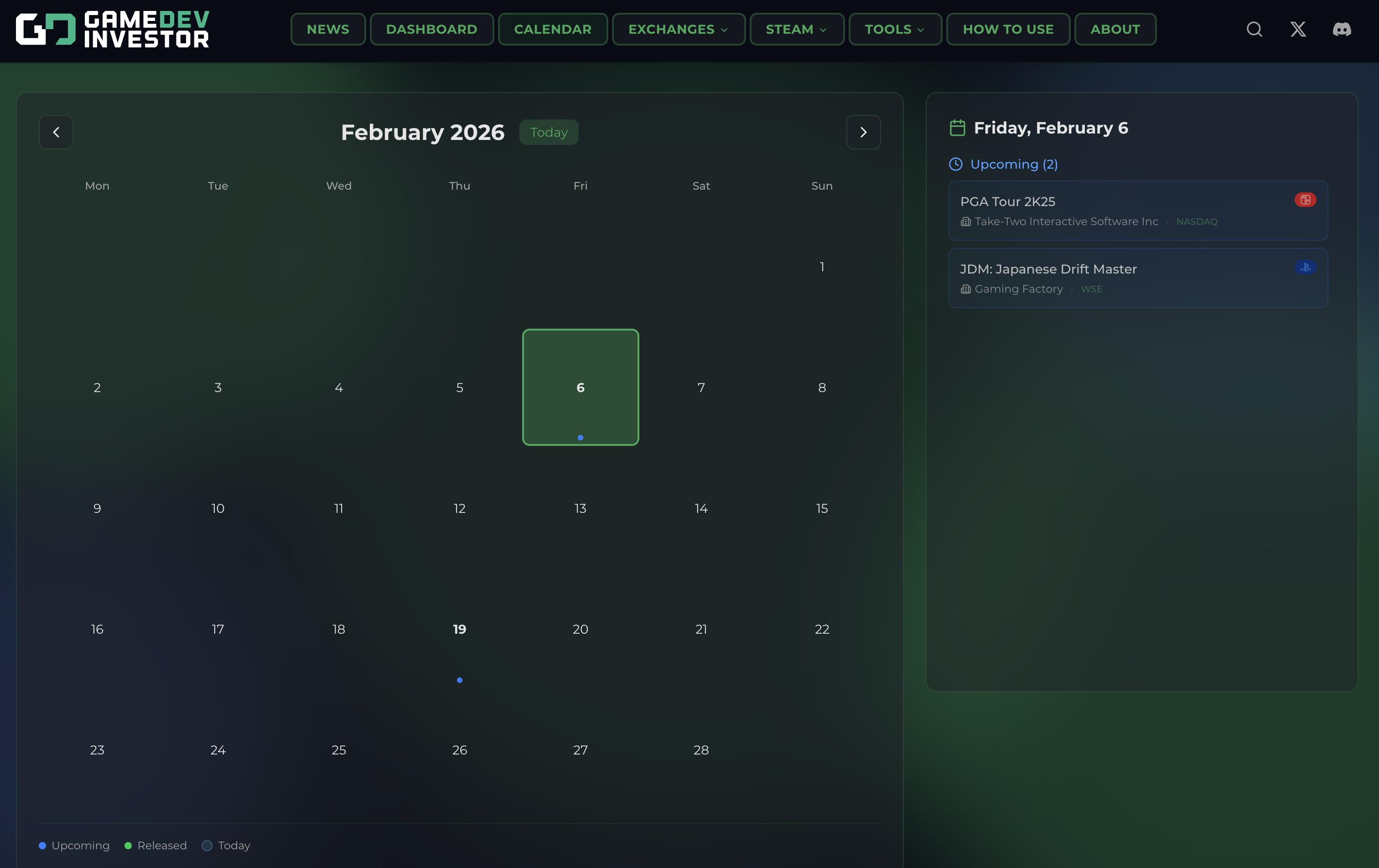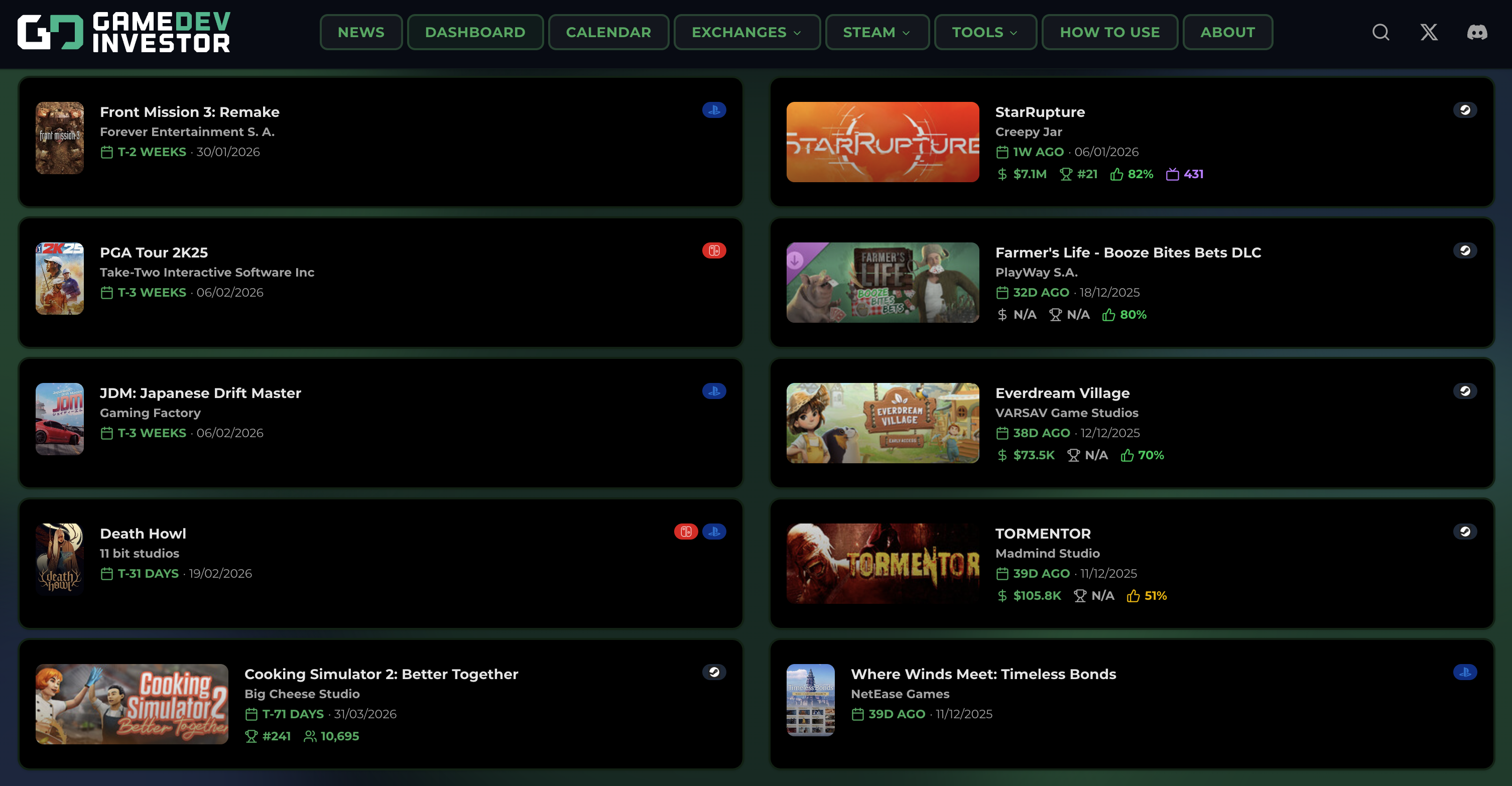 Example view showing mixed PC and PlayStation release visibility within the main GameDevInvestor dashboard.